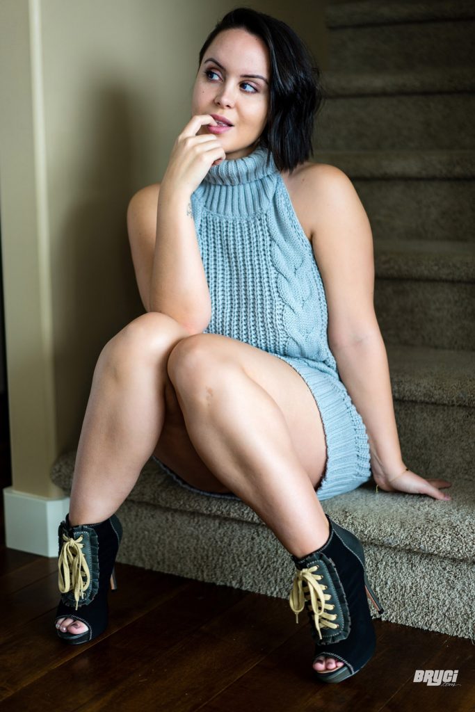 Bryci is playing the virgin killer? Ok this just made my day! You know that infamous sweater dress, super low cut in the back and she’s not even wearing any panties. I always had a feeling that Bryci picks these clothes out for herself, and the added bonus is we get to enjoy her sexuality.